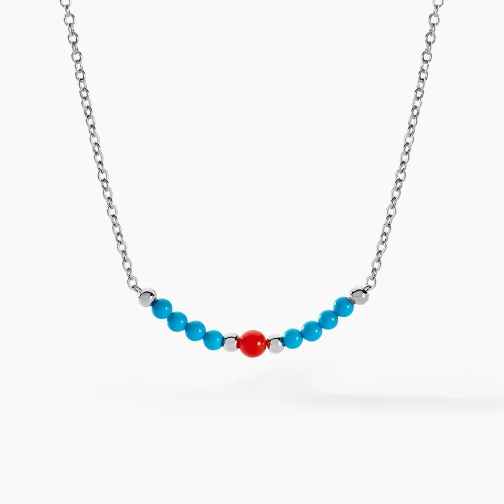 Collier Argent Blanc 925/1000 1 Boule Corail Rouge Et Boules Turquoise Maille Jaseron 38+2cm