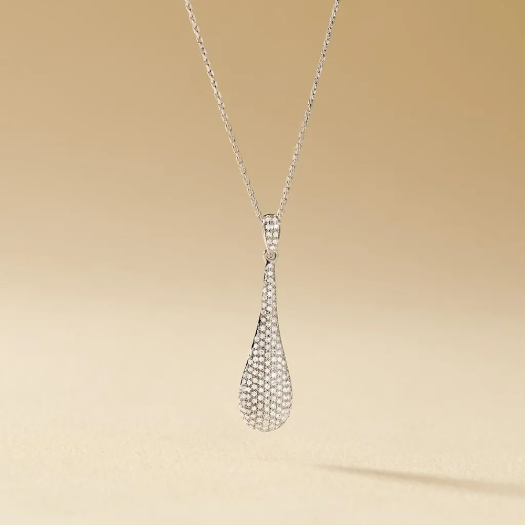 Collier Or Blanc 375/1000 Forme Goutte Pavage Diamants 42cm