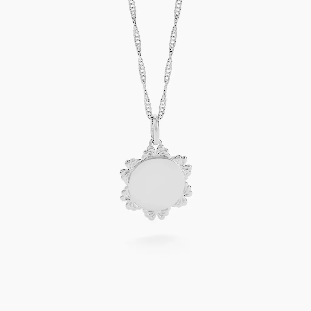 Collier Argent Blanc 925/1000 Médaille Ronde Contour Dentelé Diametre 15mm Maille Jaseron 55cm