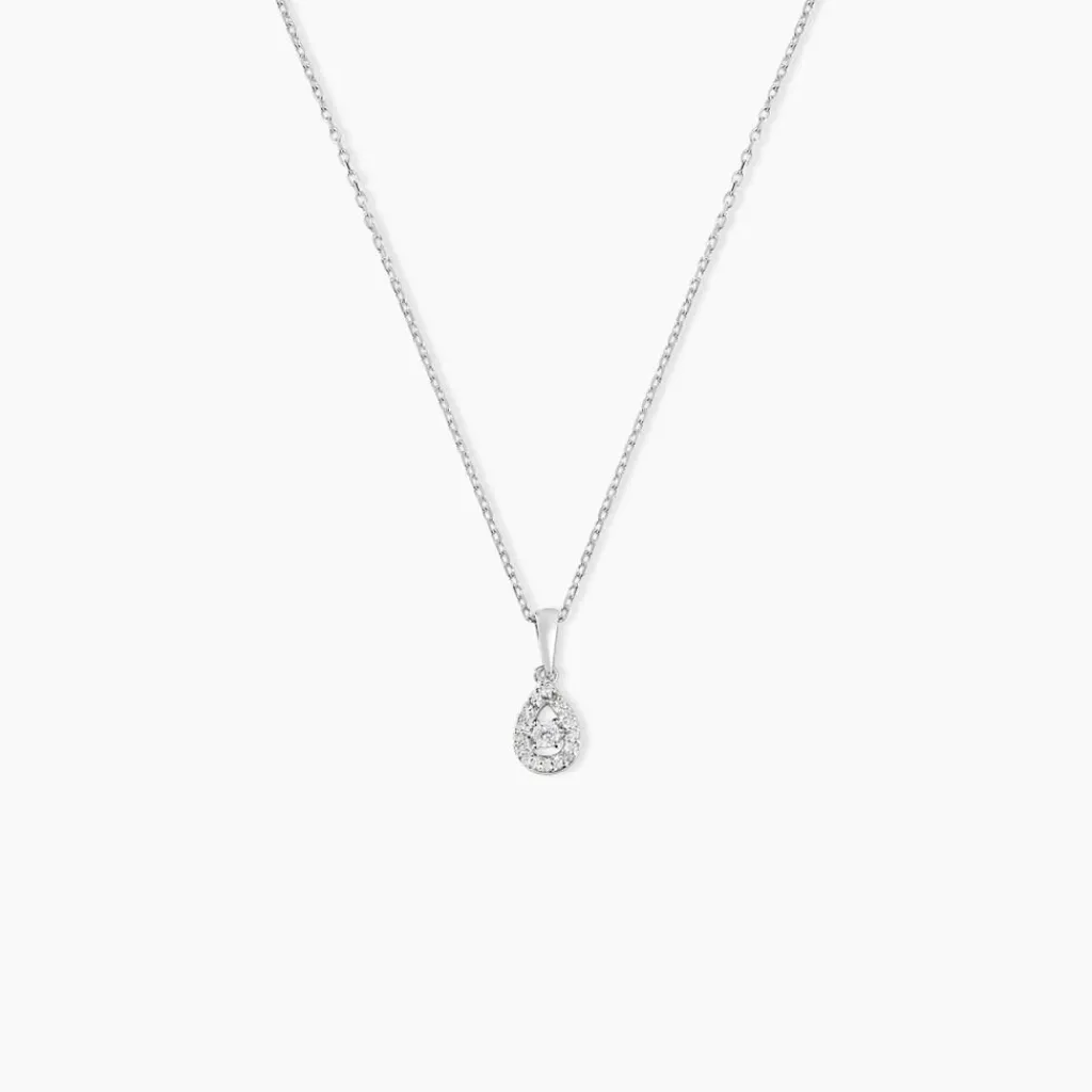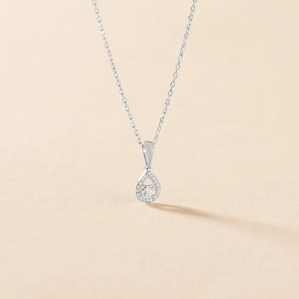 Collier Or Blanc 375/1000 Entourage Forme Poire Diamant 0.02cts 42cm