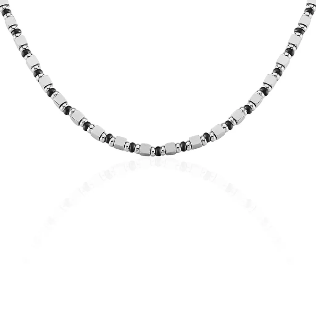 Collier Acier Bicolore Chaine Perles Fantaisies Alternee Noir Et Gris 60cm
