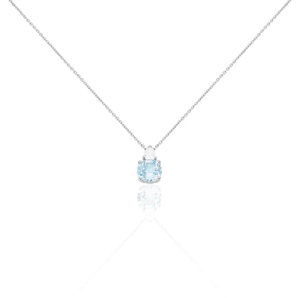 Collier Or Blanc 375/1000 Topaze Centrale Forme Ronde + Oxyde De Zirconium Taille Poire 43cm