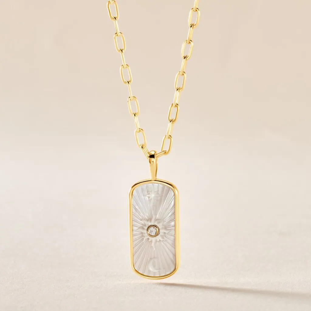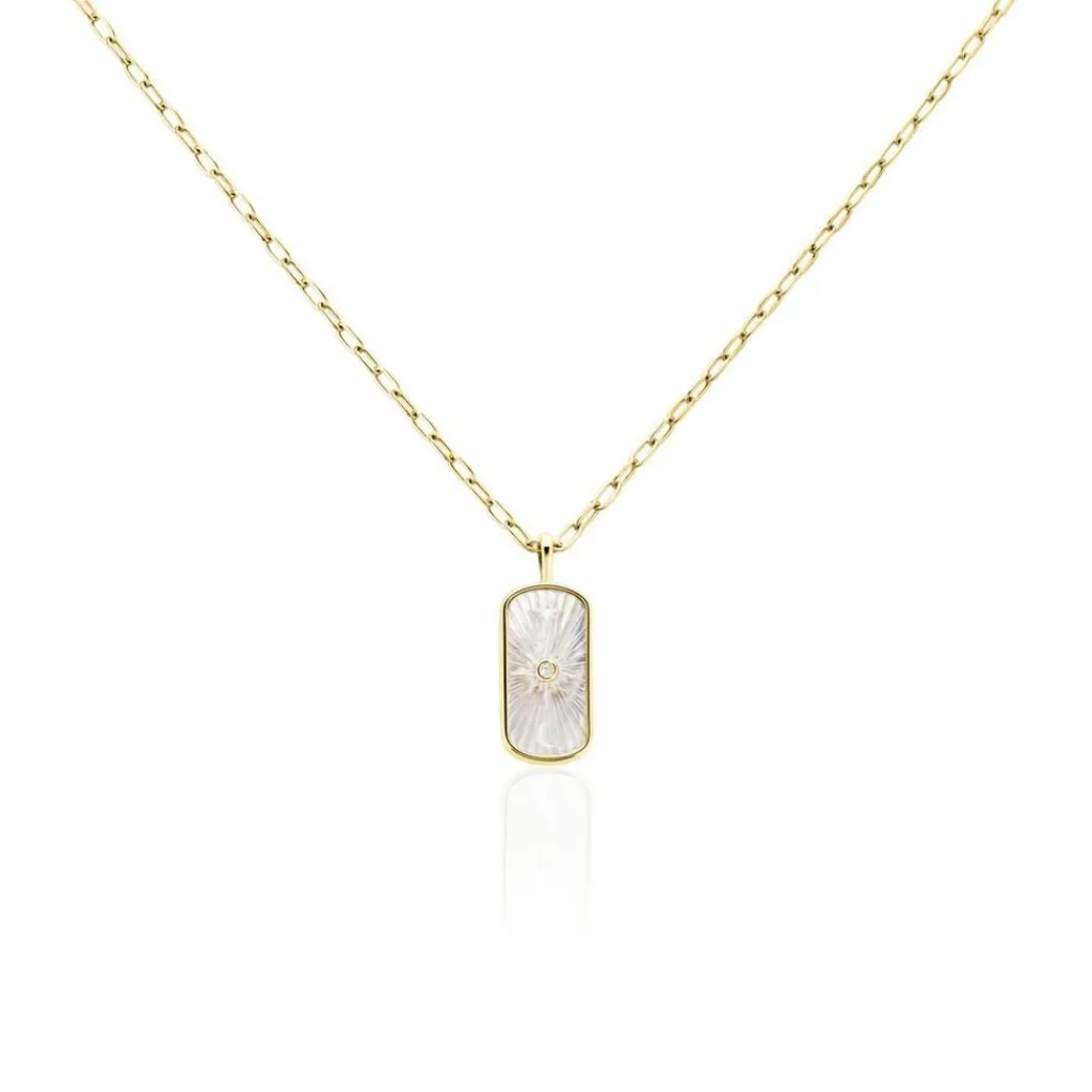 Collier Argent Doré 925/1000 Plaque Rectangulaire Nacre Blanche Striée Oxyde De Zirconium Maille Forçat 45cm