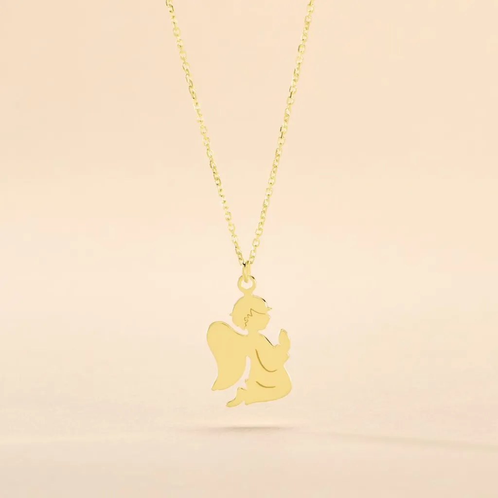 Collier Or Jaune 375/1000 Motif Ange Qui Prie Maille Jaseron 38cm
