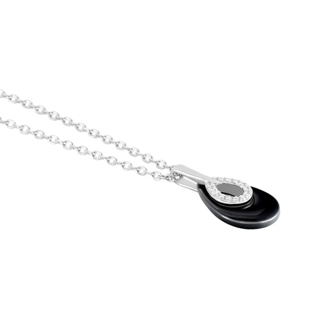 Collier Argent Blanc 925/1000 Goutte Ceramique Noire Et Oxydes De Zirconium 45cm