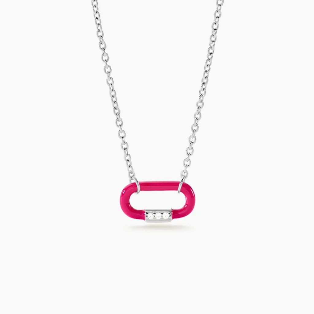 Collier Argent Blanc 925/1000 Maillon Ovale émail Rose Et Oxydes De Zirconium Maille Forçat 42+3cm