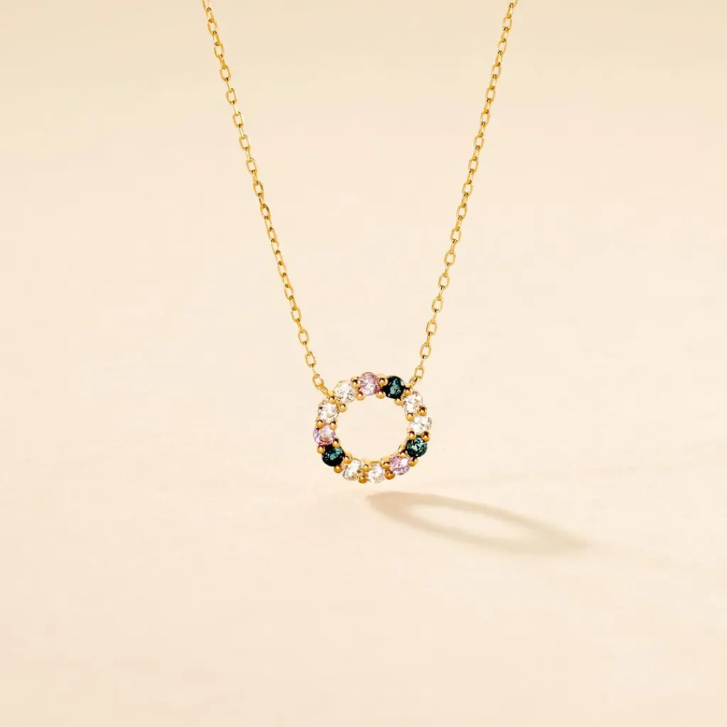 Collier Or Jaune 375/1000 Cercle Ajoure Amethyste Topaze Oxyde De Zirconium Serti Griffes Maille Forcat Ronde 40+2cm