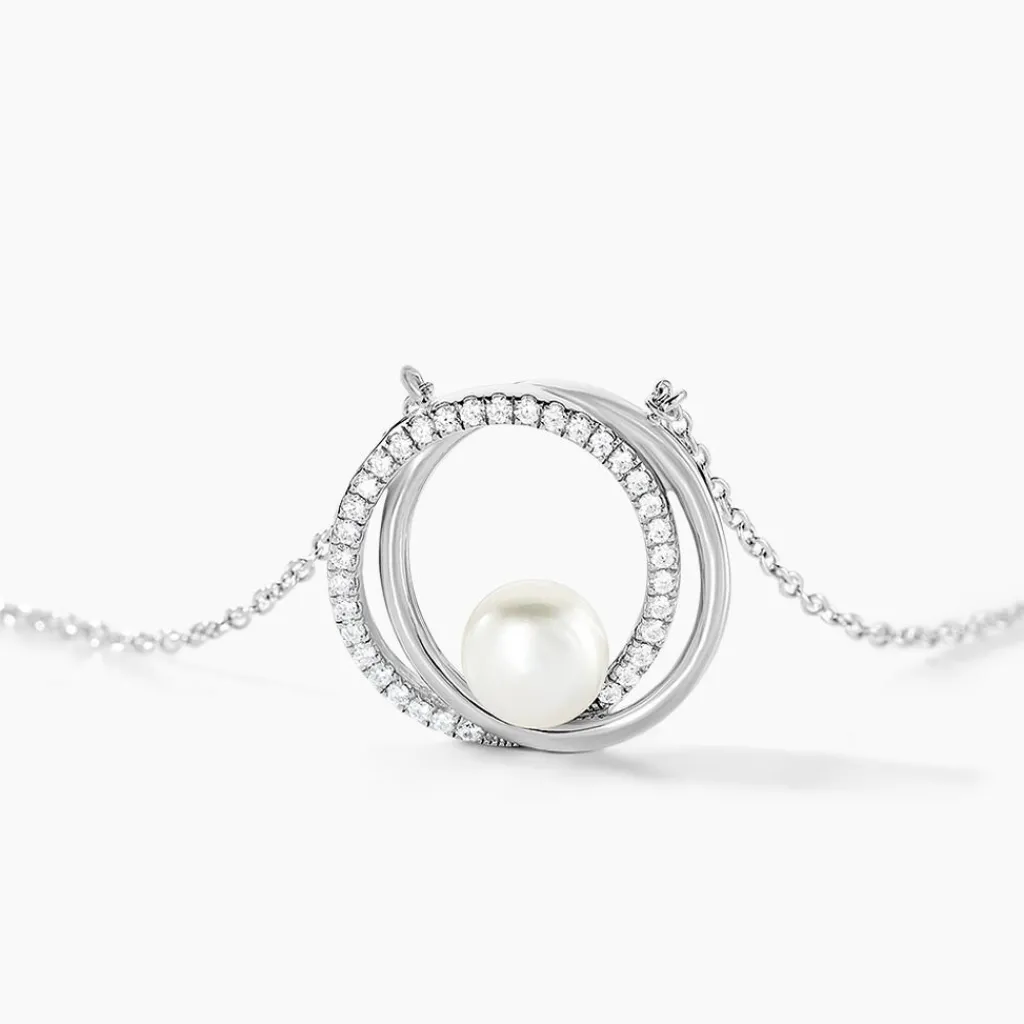 Collier Argent Blanc 925/1000 Perle De Culture Nacre Forme Ronde 6.5/7mm Et Oxydes De Zirconium