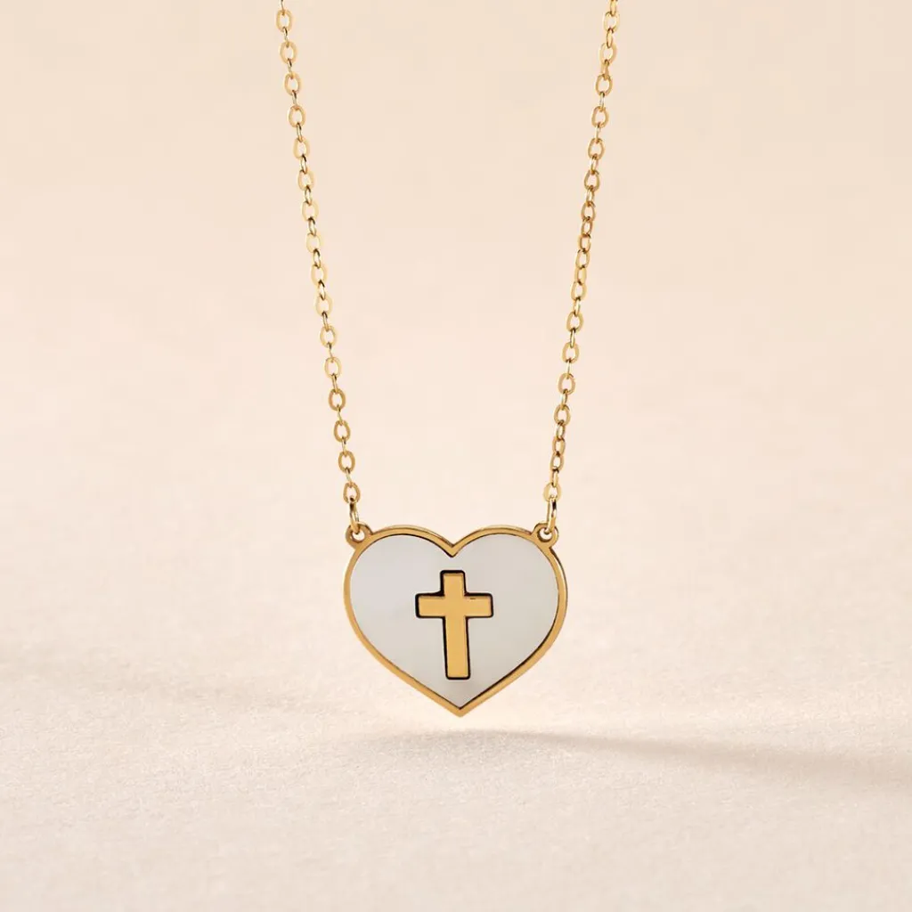Collier Or Jaune 375/1000 C艙ur Nacre Blanche Avec Croix Maille Forcat 40+2cm