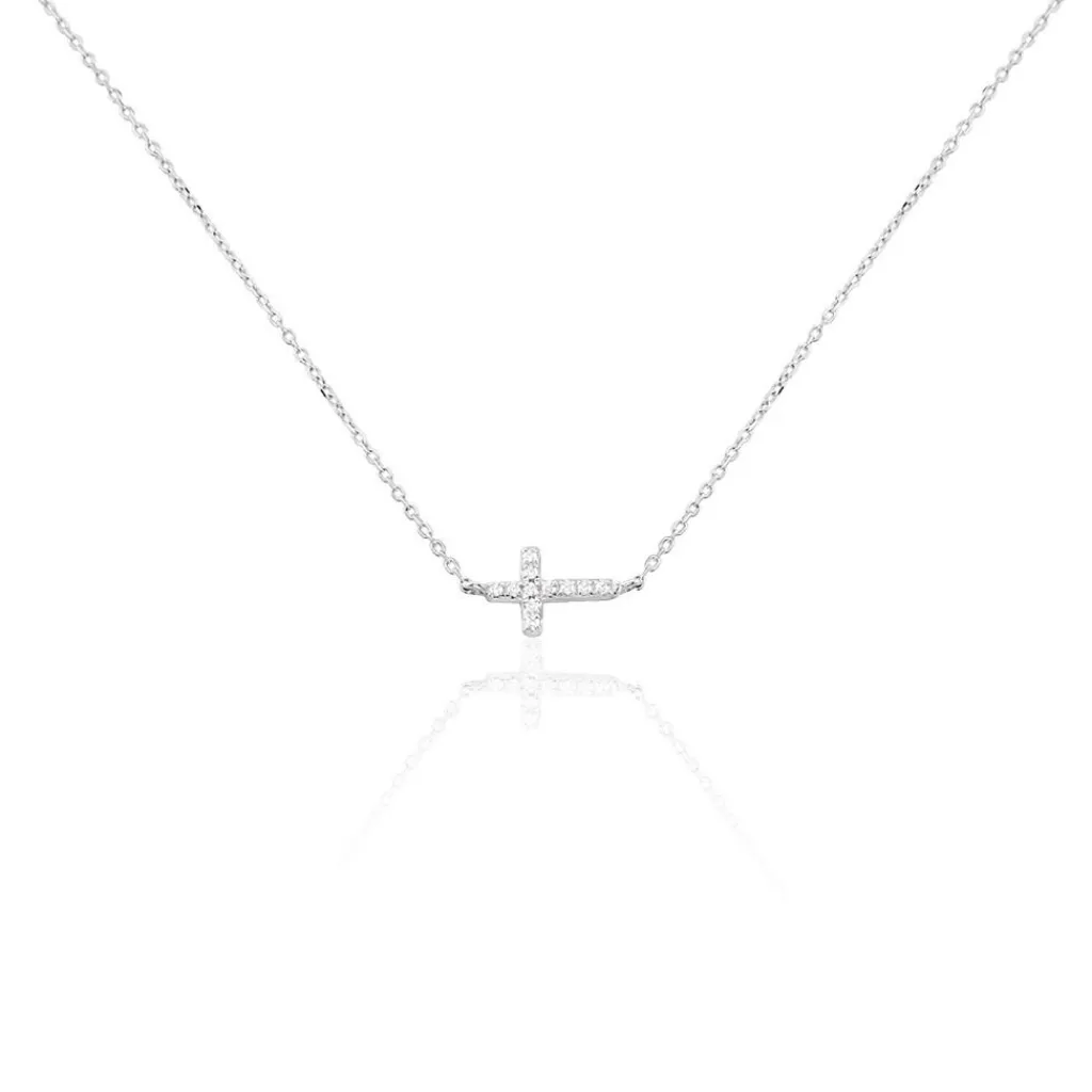 Collier Or Blanc 375/1000 Croix Oxydes De Zirconium Micro Serti Maille Forçat 42cm