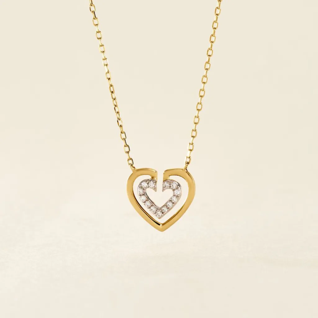 Collier Or Jaune 375/1000 Double C艙urs Ajoures Oxydes De Zirconium Micro Serti Maille Forcat Ronde 40+2cm