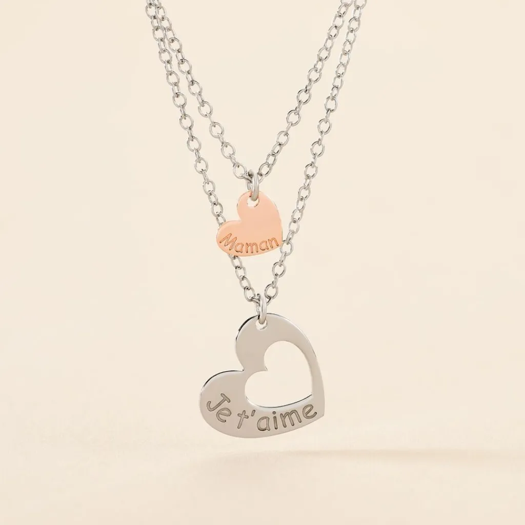Collier Argent Bicolore 925/1000 Double Chaines Pampilles C艙ur Ecriture Maman + C艙ur Ajoure Ecriture Je T’aime 42cm
