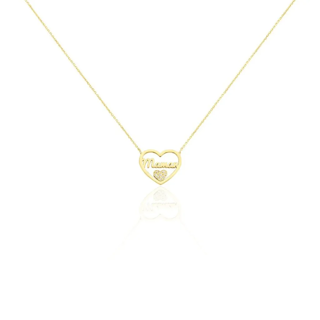 Collier Or Jaune 375/1000 Coeur Ajoure Message Maman + C艙ur Pavage Oxyde De Zirconium Maille Jaseron 40+2cm
