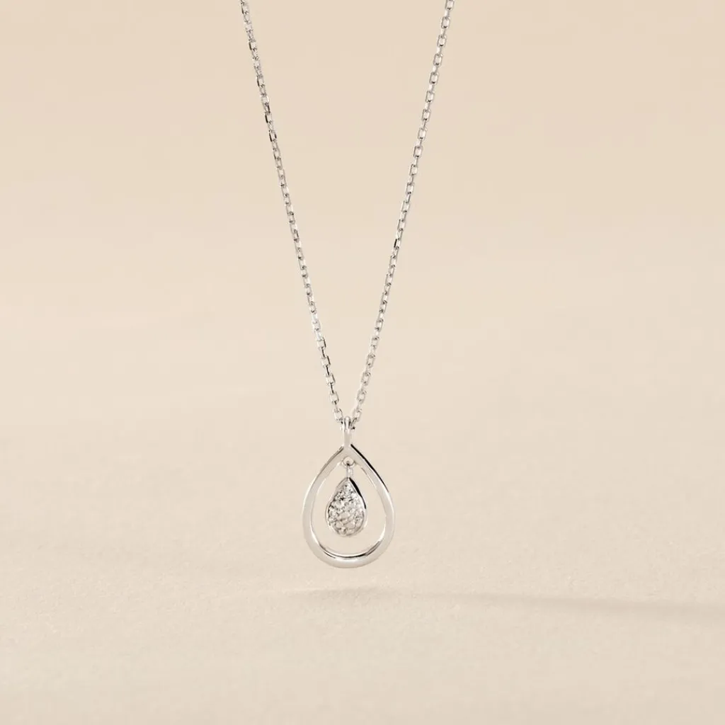 Collier Or Blanc 375/1000 Forme Double Goutte Pavage Diamants Maille Forçat 50cm