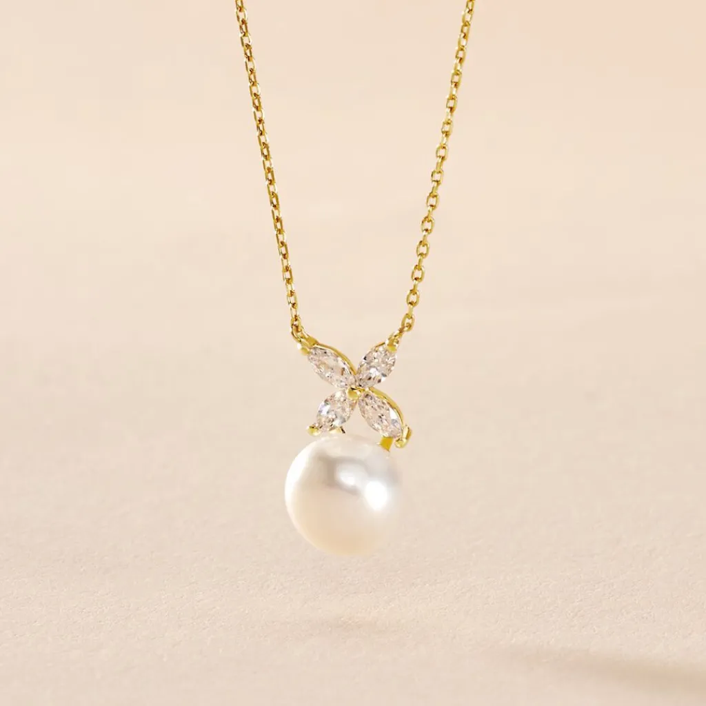 Collier Or Jaune 375/1000 Fleur Oxydes De Zirconium Perle De Culture 8mm 43cm