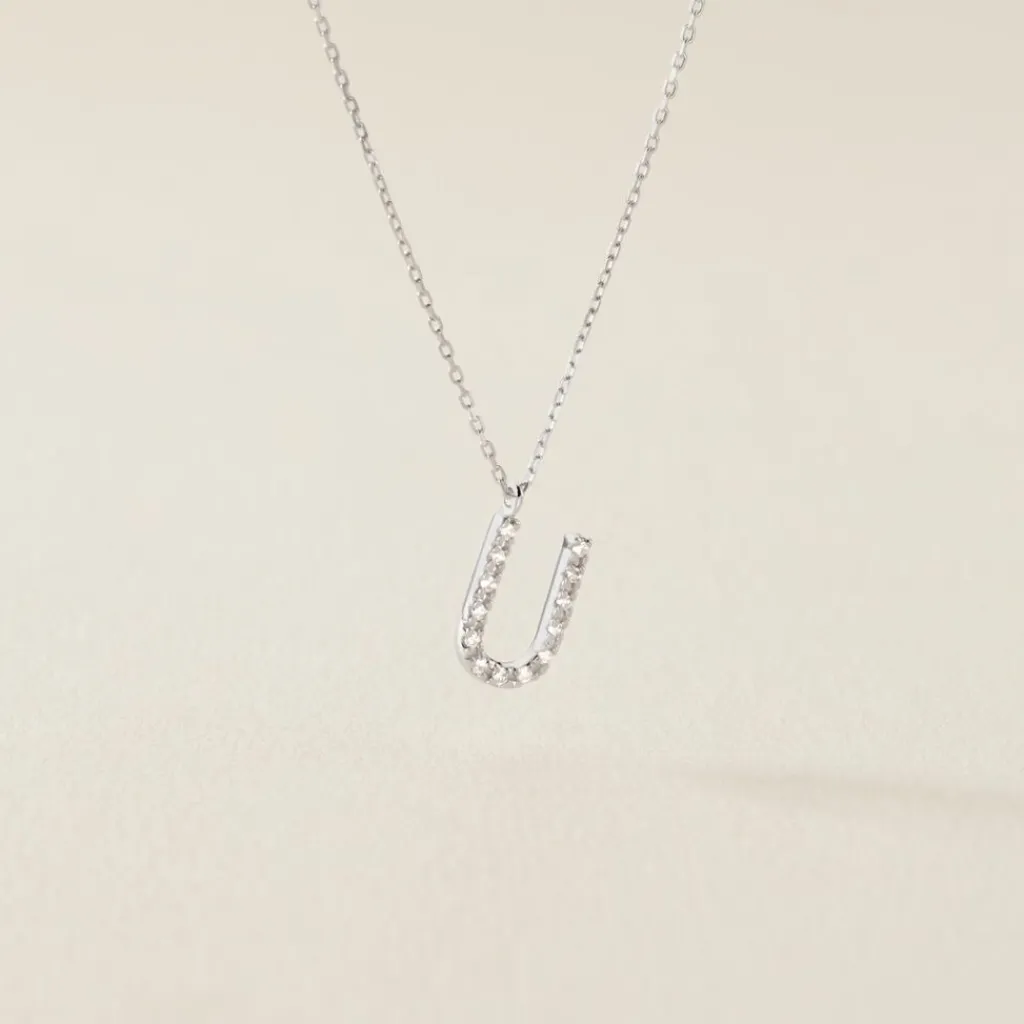Collier Or Blanc 375/1000 Lettre U Pavage Diamants Maille Forçat 42cm