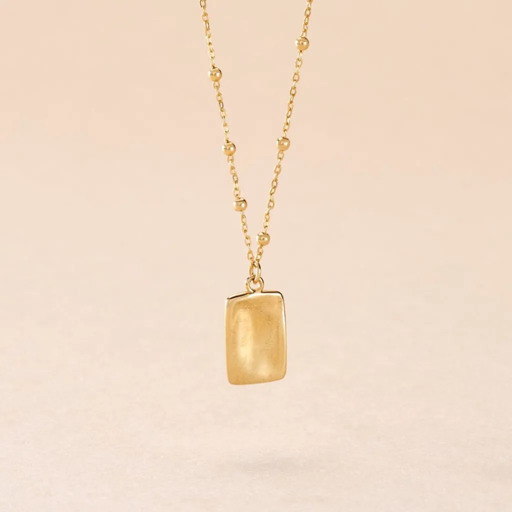 Collier Or Jaune 375/1000 Plaque Rectangle Martelee 9.6mm X 6.5mm Maille Jaseron Alternee Boules 40+2cm