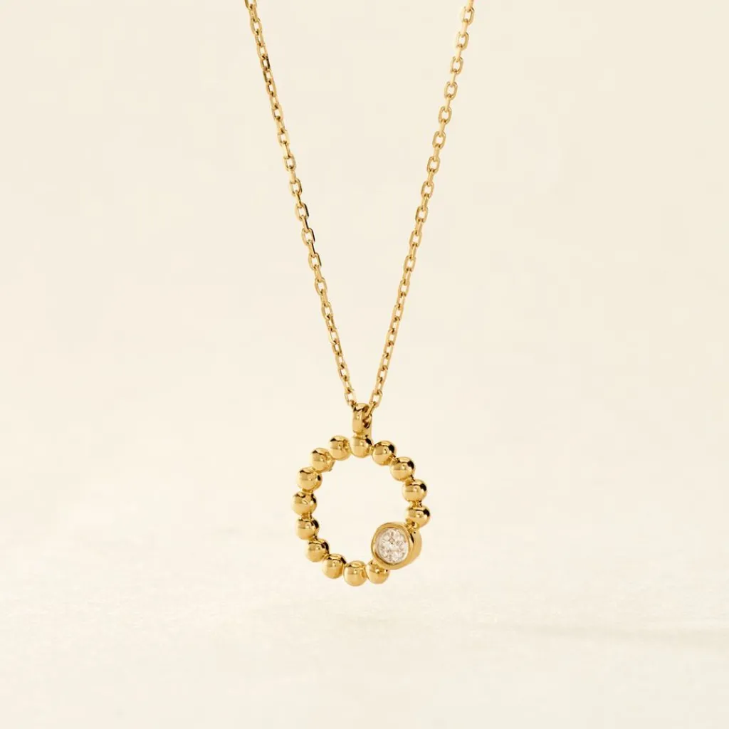 Collier Or Jaune 375/1000 Pastille Sur Cercle Effet Perle Pavage Diamants 0.015cts Maille Forcat 42+2cm