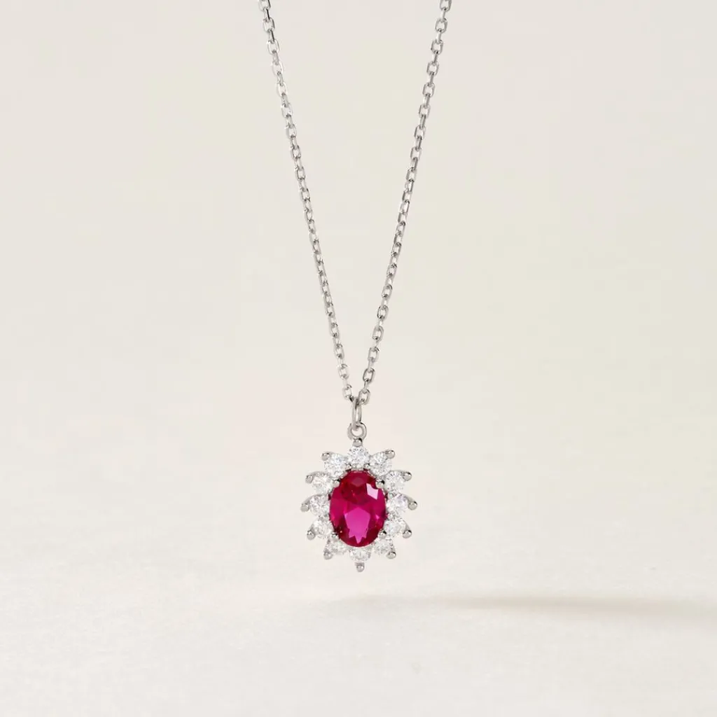Collier Solitaire Argent 925/1000 perezforme Marguerite Rouge Serti Griffes Entourage Oxydes Maille Forcat 45cm