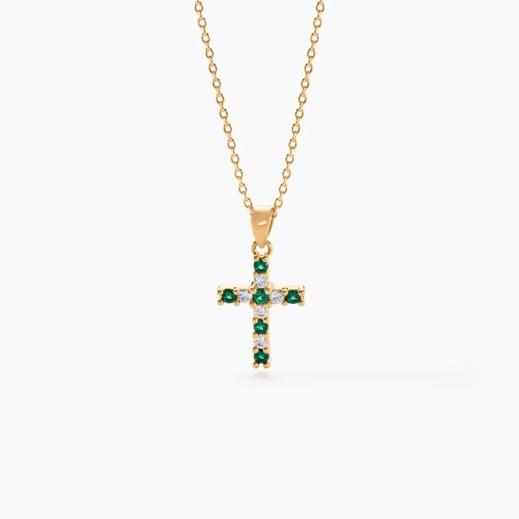 Collier Plaqué Or Croix Pierres Synthétiques Vertes Et Oxydes De Zirconium Maille Forcat 45cm