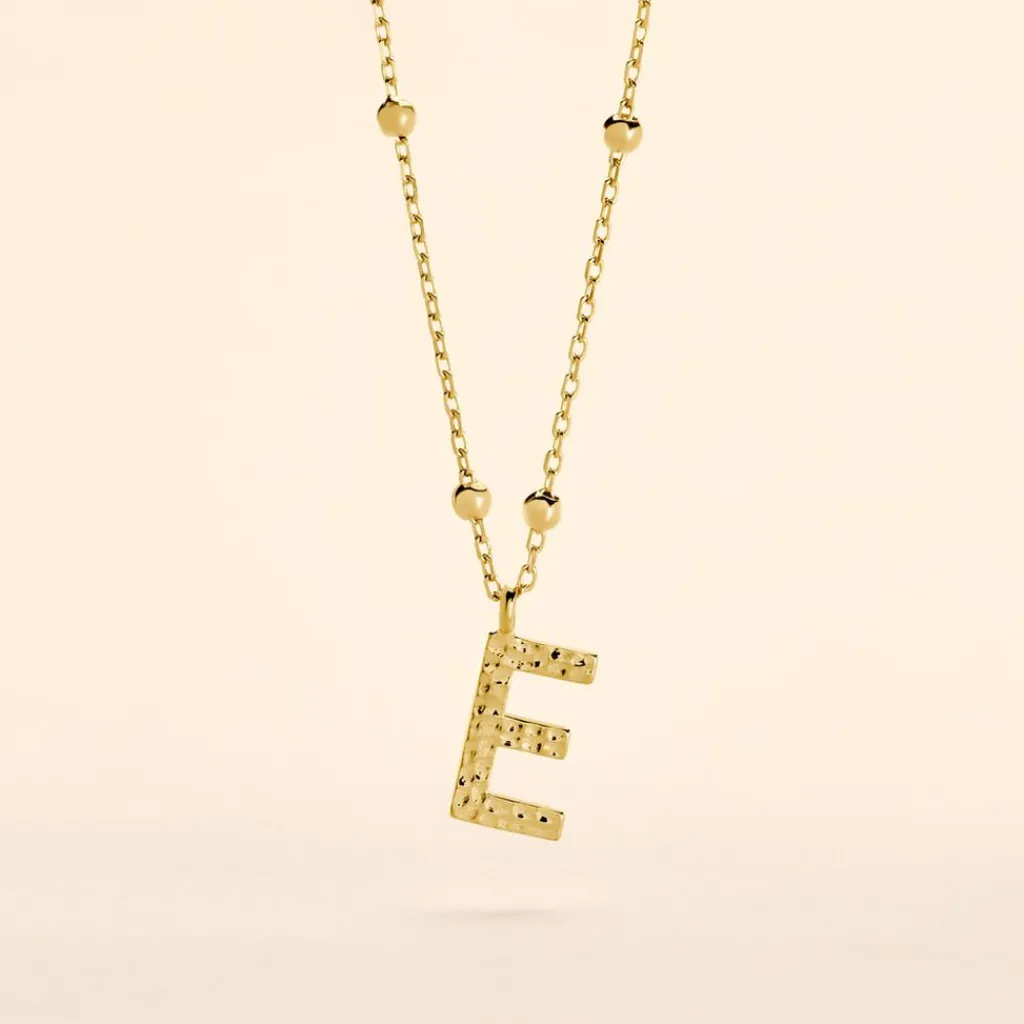 Collier Plaque Or Jaune Lettre E Martelee Et Petites Boules Chaine Maille Forcat Longueur 45cm