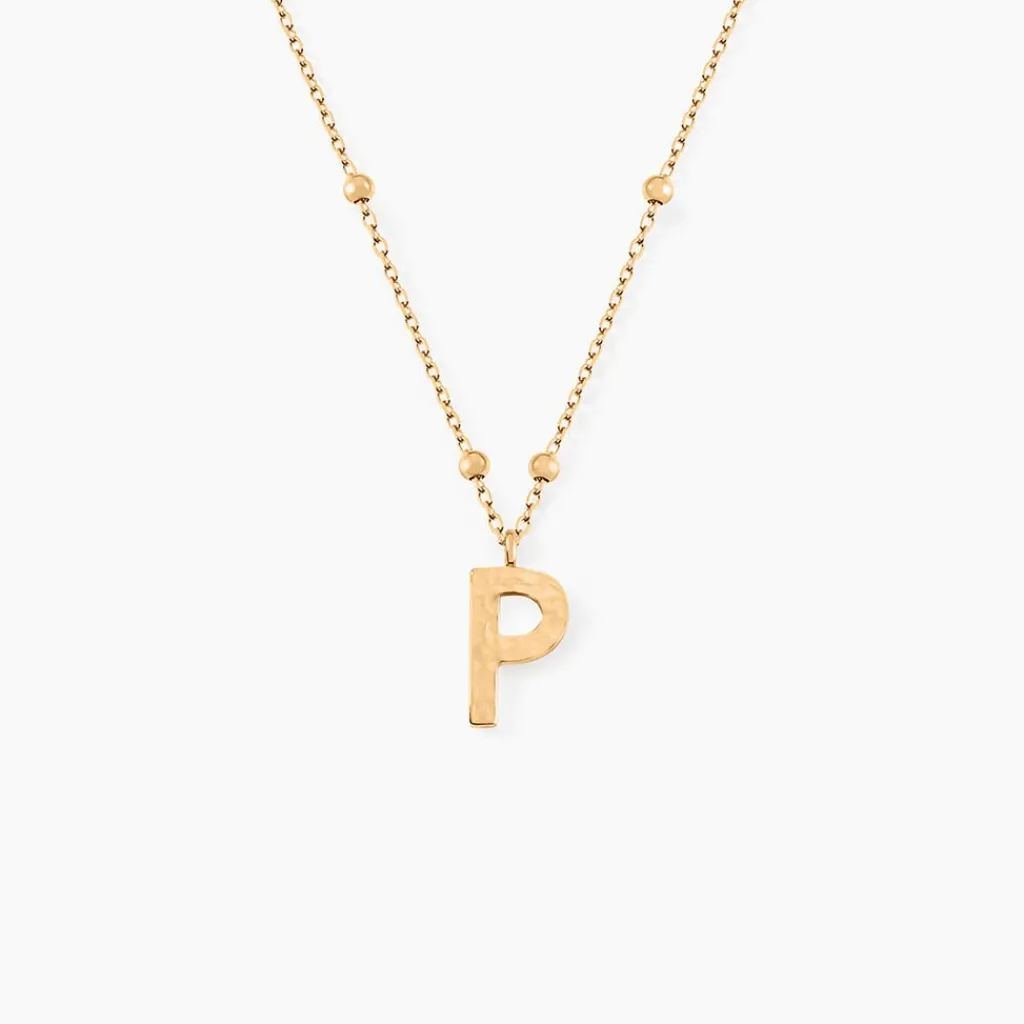 Collier Plaque Or Jaune Lettre P Martelee Et Petites Boules Chaine Maille Forcat Longueur 45cm
