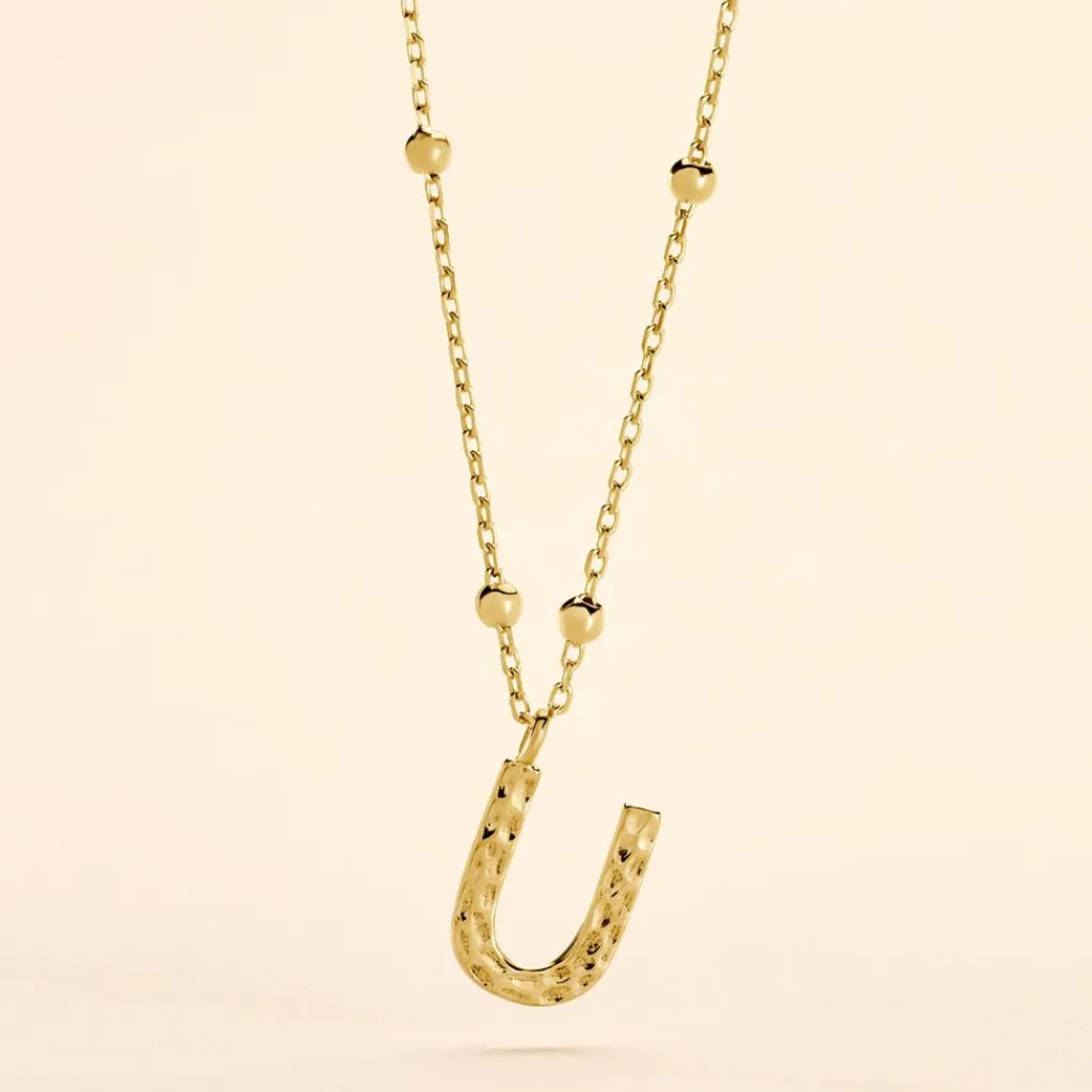 Collier Plaque Or Jaune Lettre U Martelee Et Petites Boules Chaine Maille Forcat Longueur 45cm