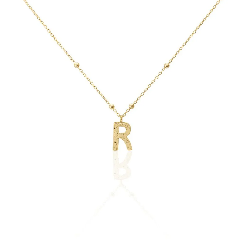 Collier Plaque Or Jaune Lettre R Martelee Et Petites Boules Chaine Maille Forcat Longueur 45cm