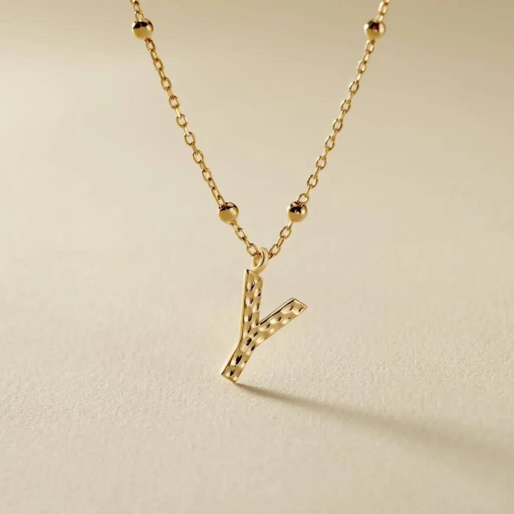 Collier Plaque Or Jaune Lettre Y Martelee Et Petites Boules Chaine Maille Forcat Longueur 45cm