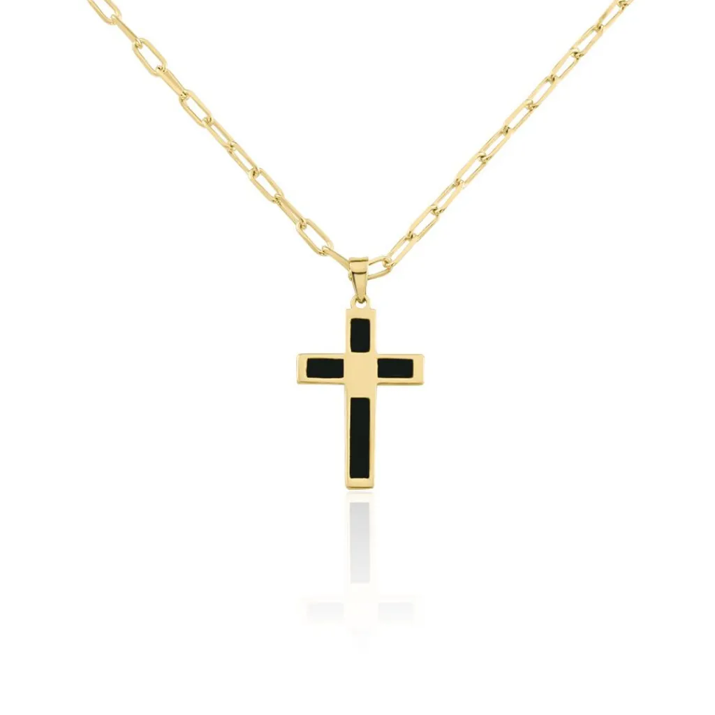 Collier Plaqué Or Jaune Croix Email Noir Maille Cheval 55cm