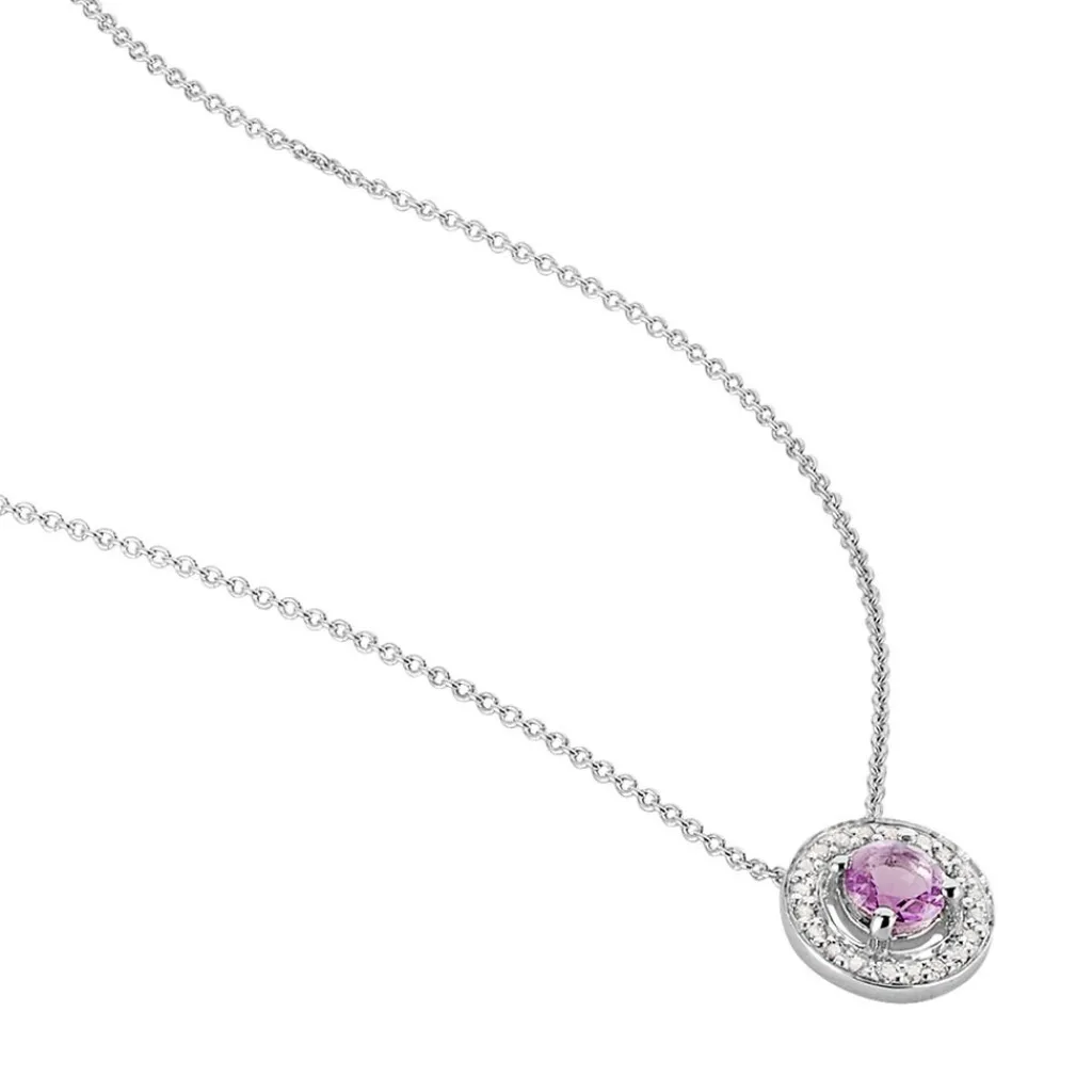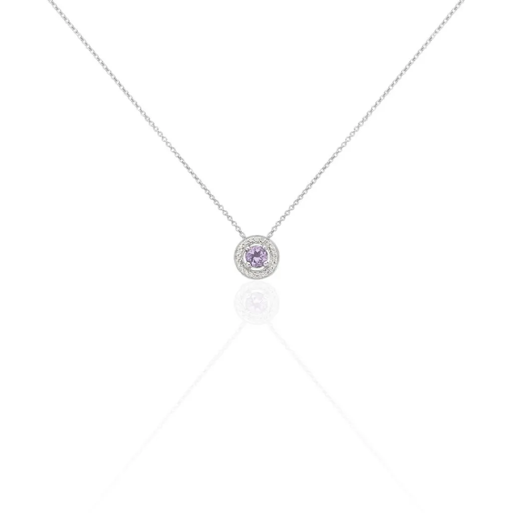 Collier Or Blanc 375/1000 Forme Cercle Ajoure Améthyste Centrale Serti Griffes Entourage Oxydes De Zirconium 50cm
