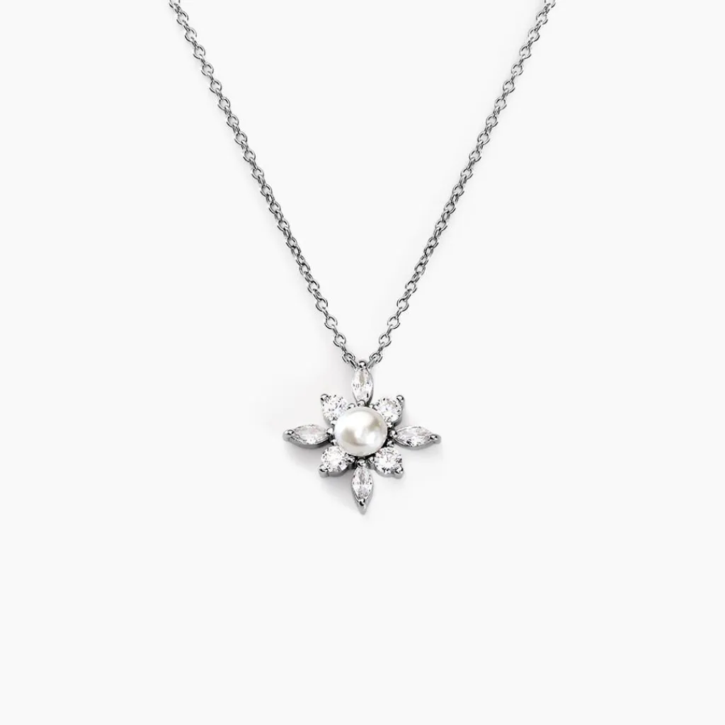 Collier Argent Blanc 925/1000 Flocon Perle De Culture Et Oxydes De Zirconium Maille Forçat 42+3cm
