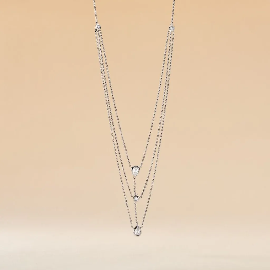 Collier Argent Blanc 925/1000 Triple Chaine Goutte Et Cercle Oxydes De Zirconium Maille Jaseron 38+2cm