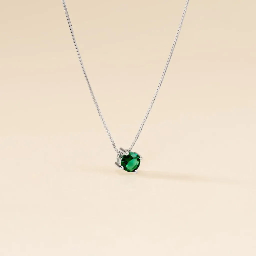 Collier Solitaire Argent Blanc 925/1000 Oxyde De Zirconium Vert Serti 4 Griffes Maille Venitienne 45cm