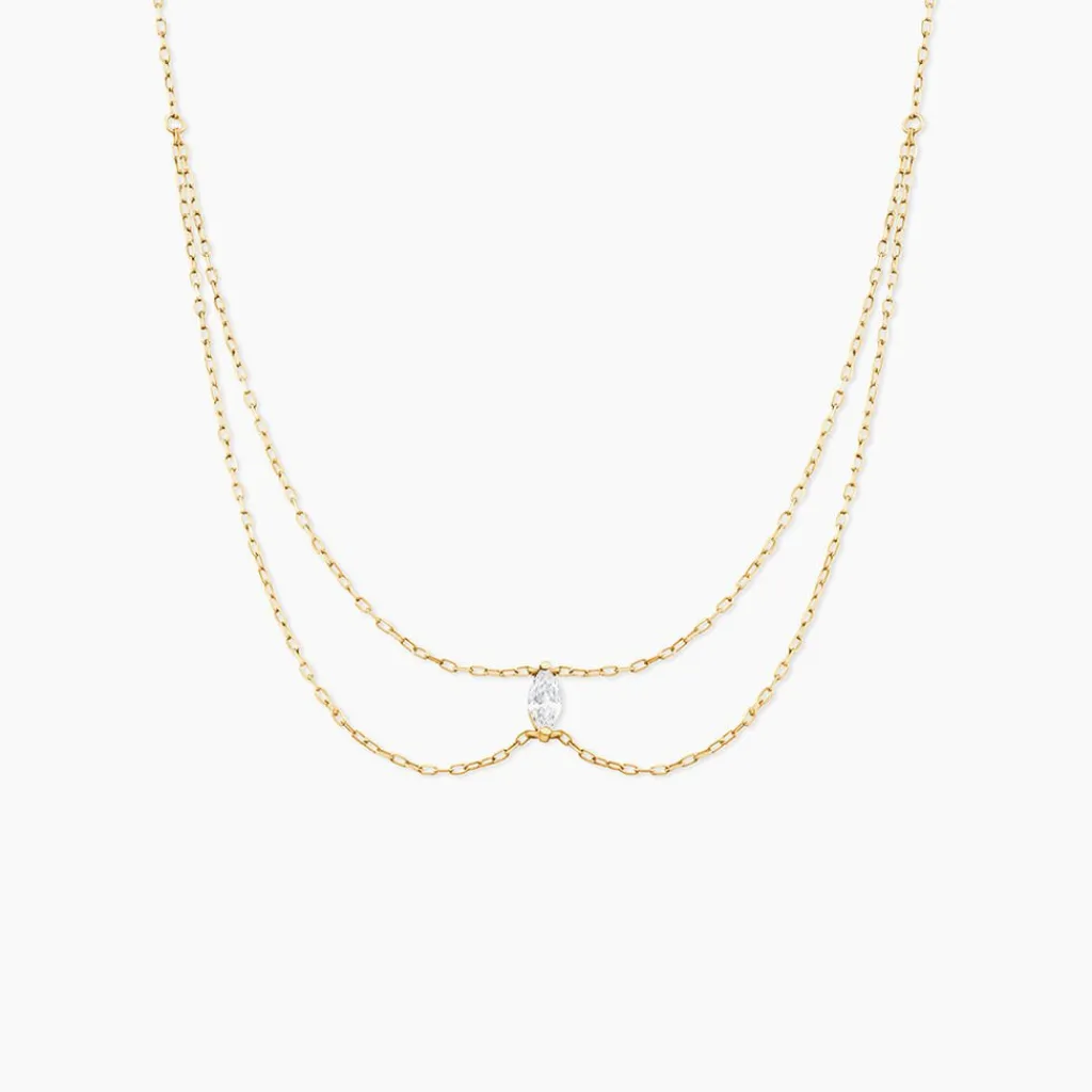 Collier Or Jaune 375/1000 Chocker Double Chaine Solitaire Navette Oxyde De Zirconium Serti Griffes Maille Forcat 35Cm