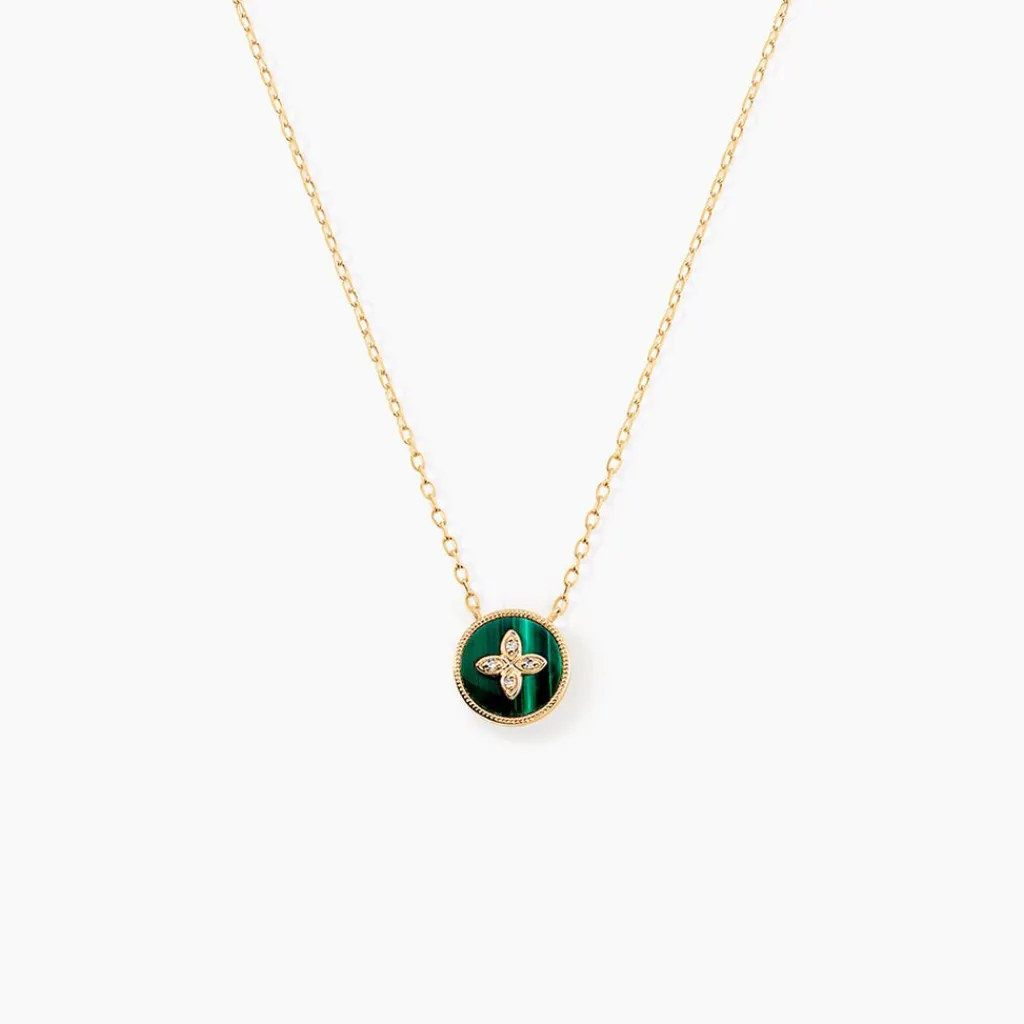 Collier Or Jaune 375/1000 Malachite Verte Et Motif Fleur Diamants Maille Forcat 40+2Cm