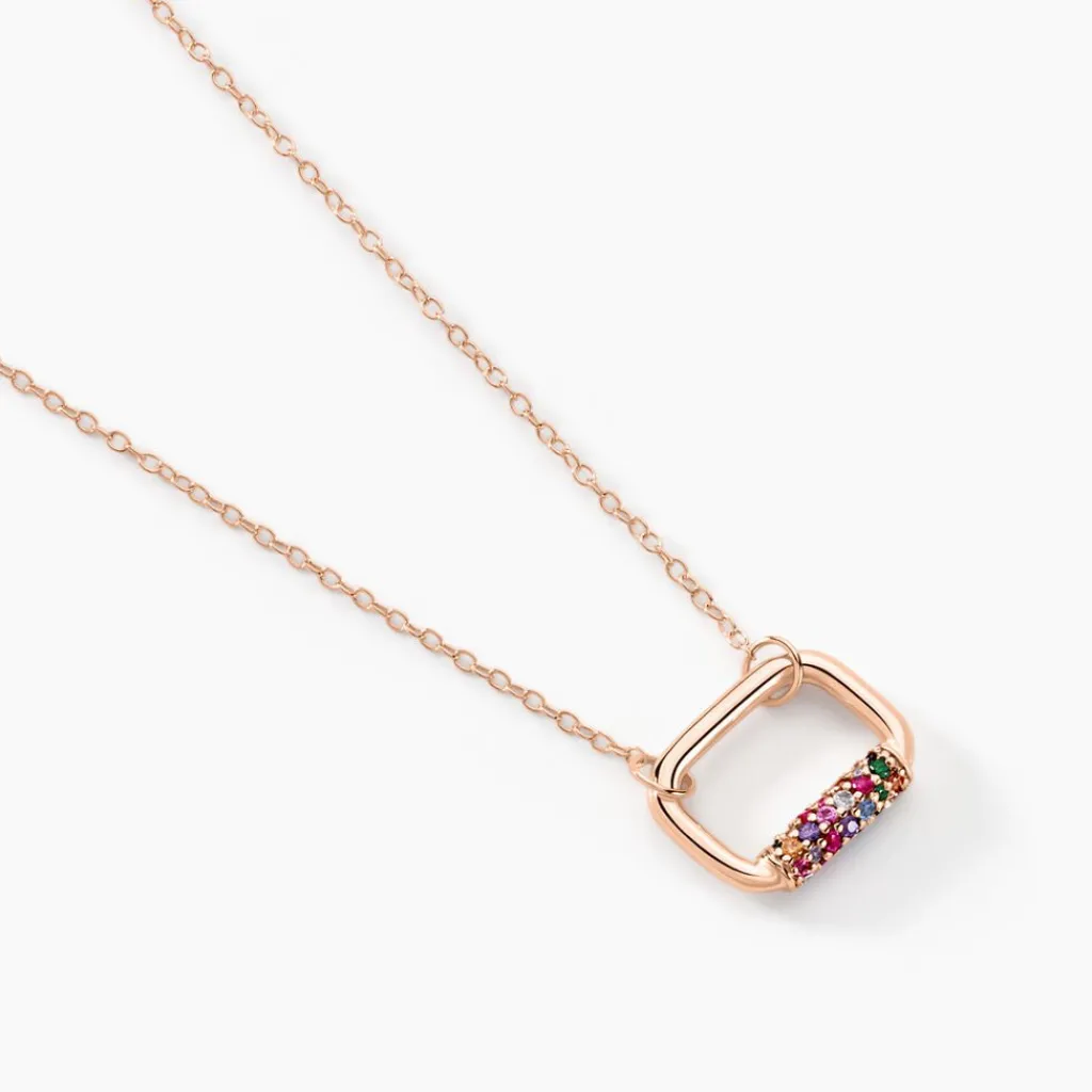 Collier Argent Rose 925/1000 Rectangle Pavage Pierres Multicolores Maille Forcat 43+2cm