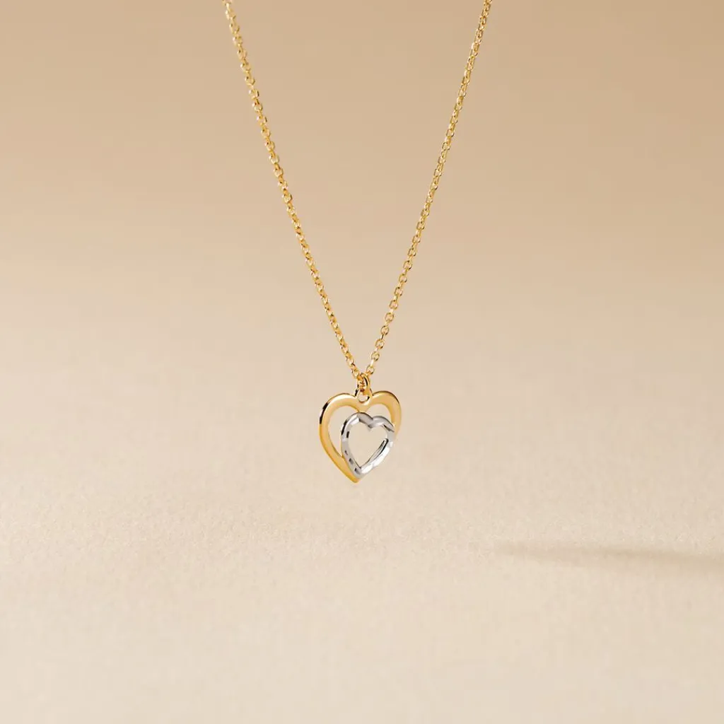 Collier Or Jaune 375/1000 Double C艙urs Ajoures Avec Un C艙ur Effet Diamante Argente Maille Jaseron 40+2cm