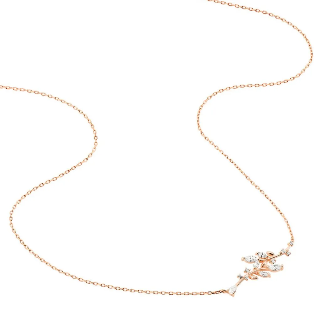 Collier Argent Rose 925/1000 Motif Feuilles Oxydes De Zirconium 45cm