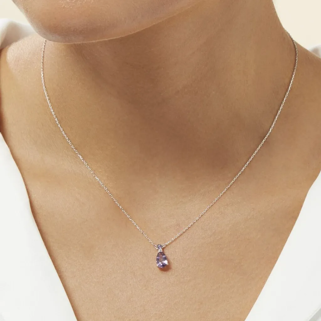 Collier Or Blanc 375/1000 Maille Forçat Améthyste Poire Serti Griffes 40cm
