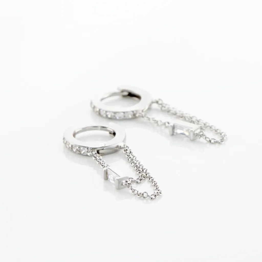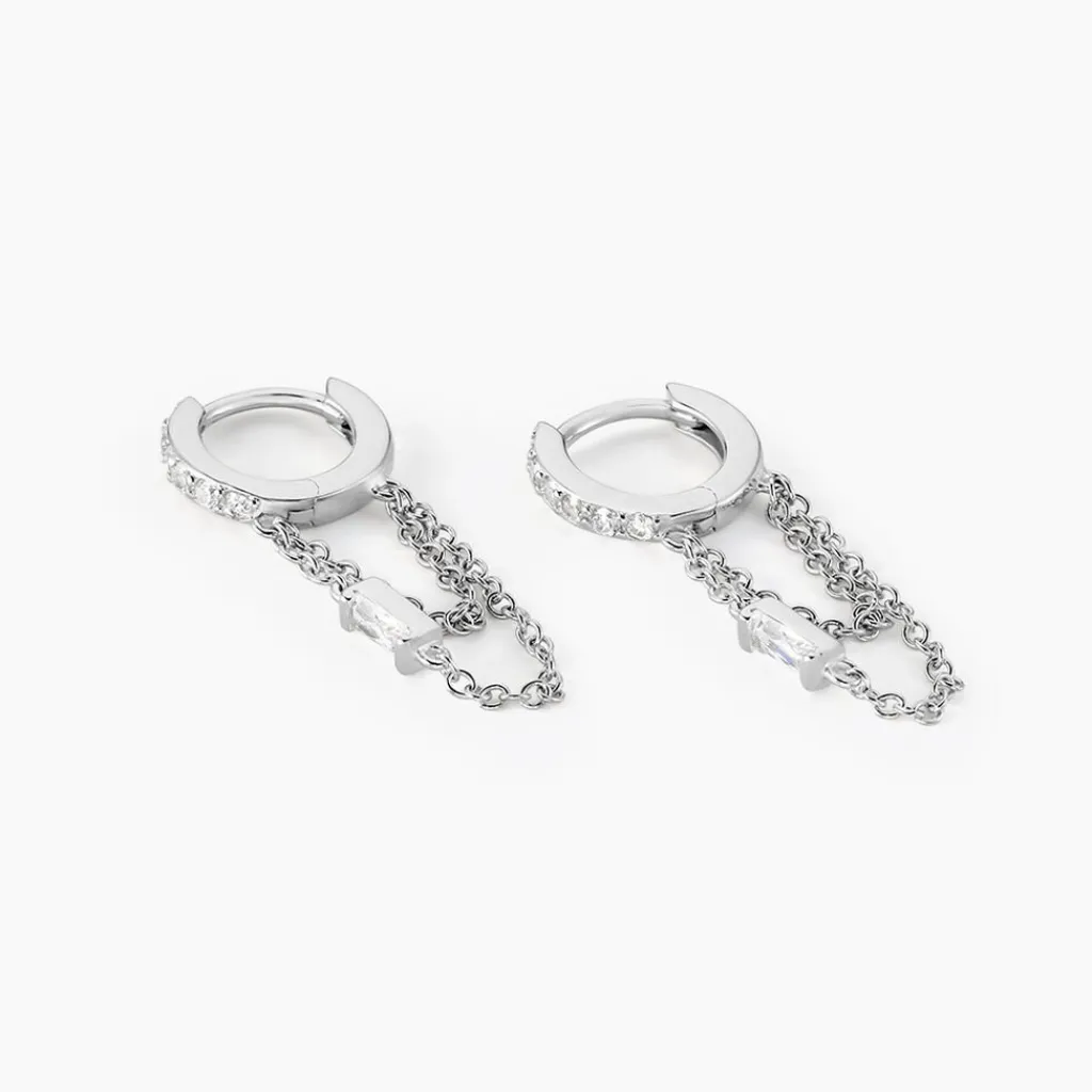 Creole Argent Blanc 925/1000 Pavage Oxydes De Zirconium Double Chaine Serti Clos Oxydes De Zirconium Diametre 14mm