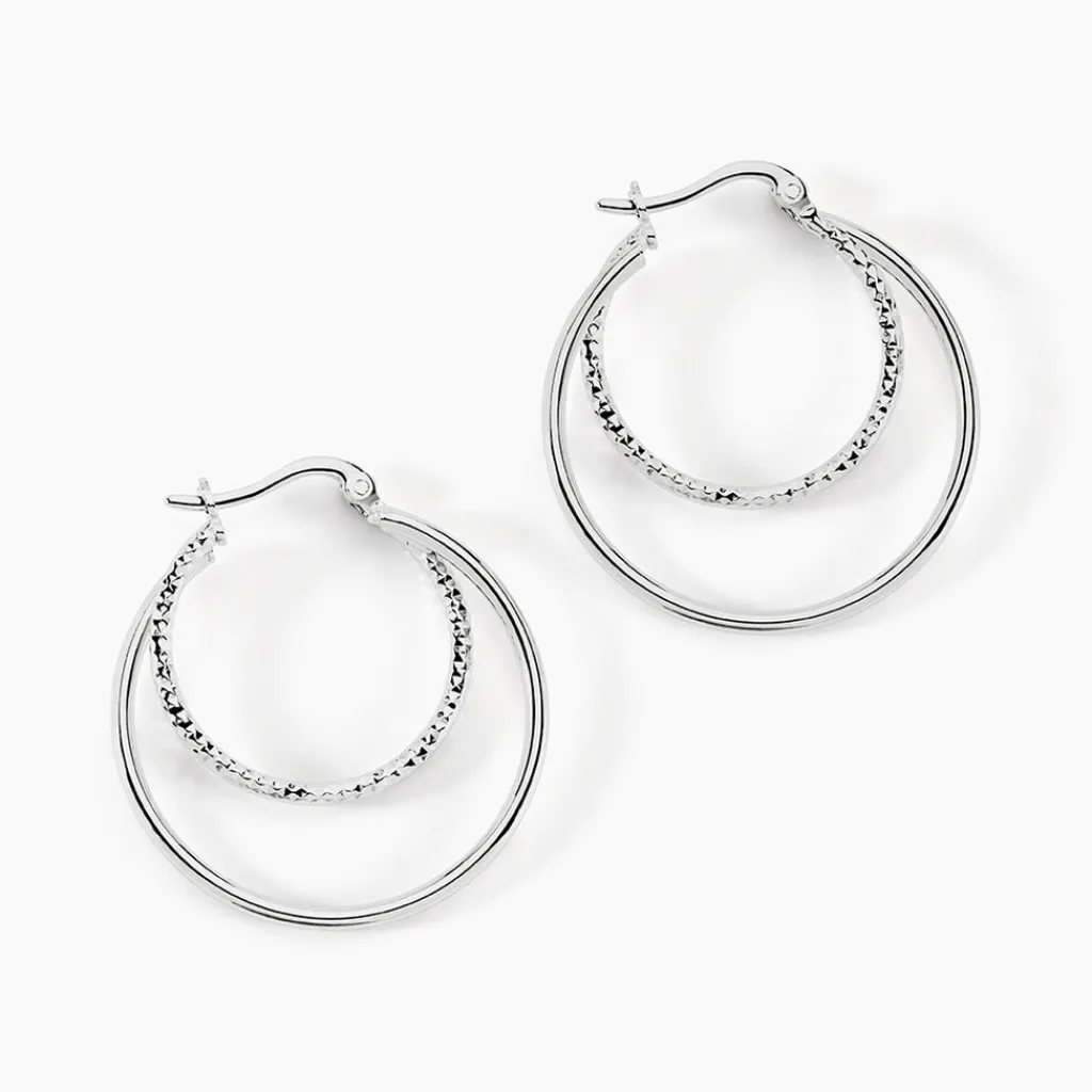 Créoles Argent Blanc 925/1000 Double Fil 1 Lisse 1 Diamante Largeur 1.5mm Diametre 20mm