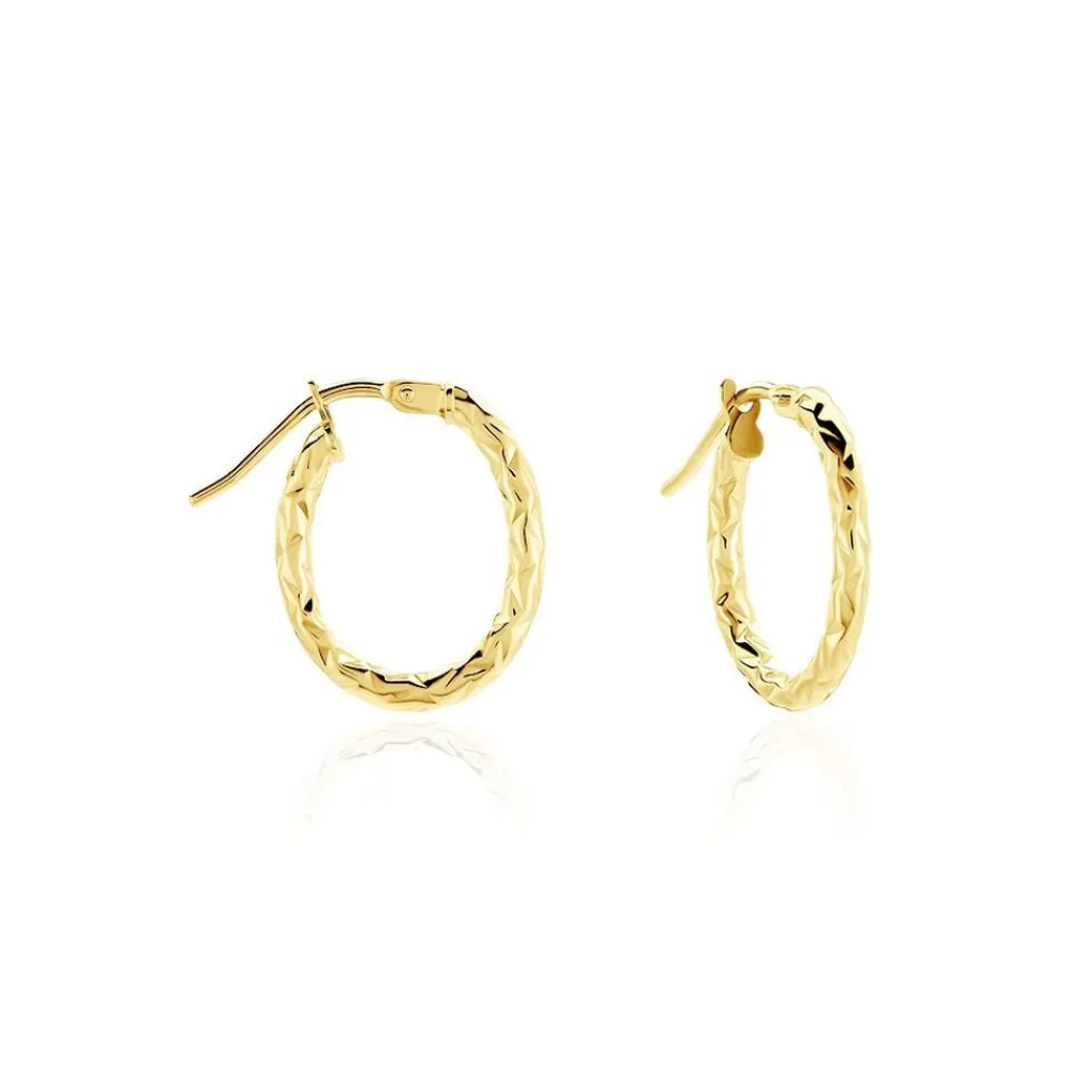 Creoles Or Jaune 375/1000 Ovales Fil Rond Effet Diamante Largeur 2mm Diametre 18.1mmx14.6mm