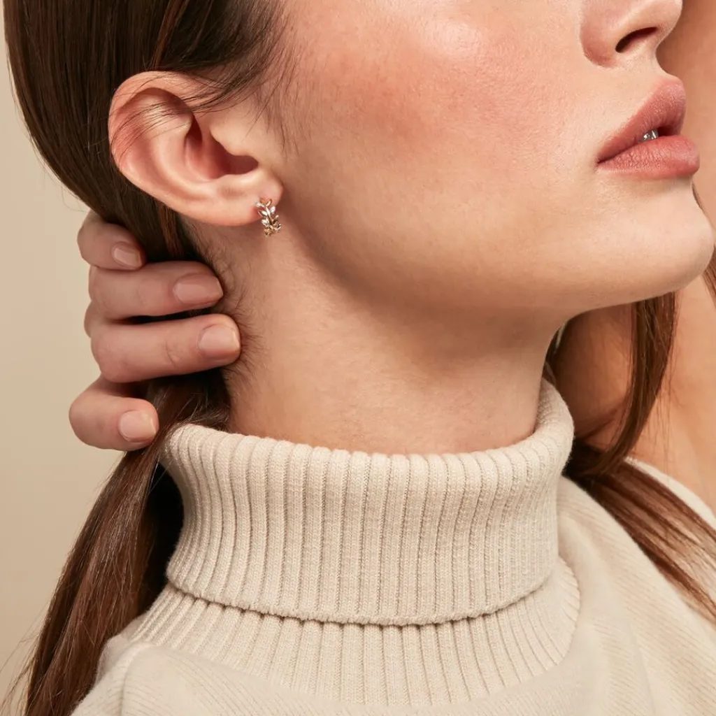 Demi Creoles Or Jaune 375/1000 Feuilles Semi Pavage Diamants Ronds