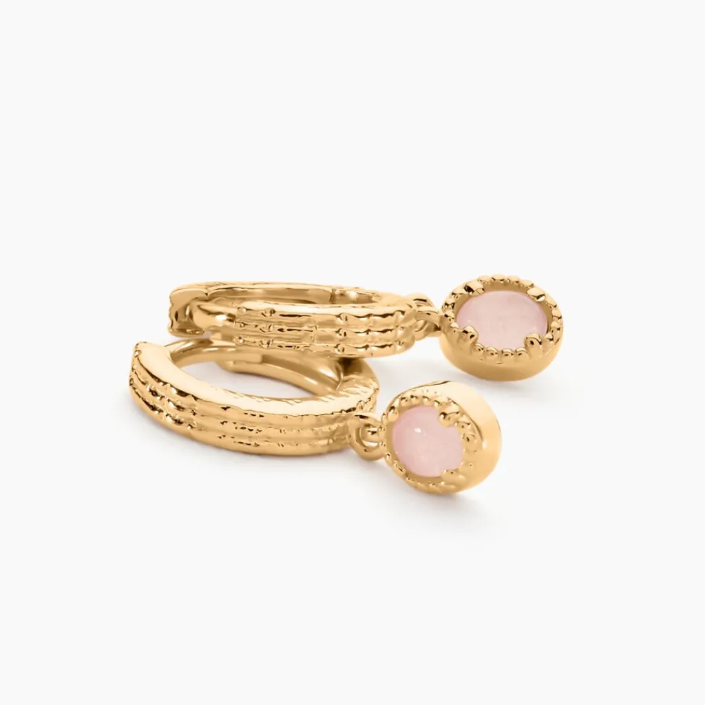 Créoles Plaqué Or Jaune Striées Quartz Roses Serti Clos Diamètre 10mm