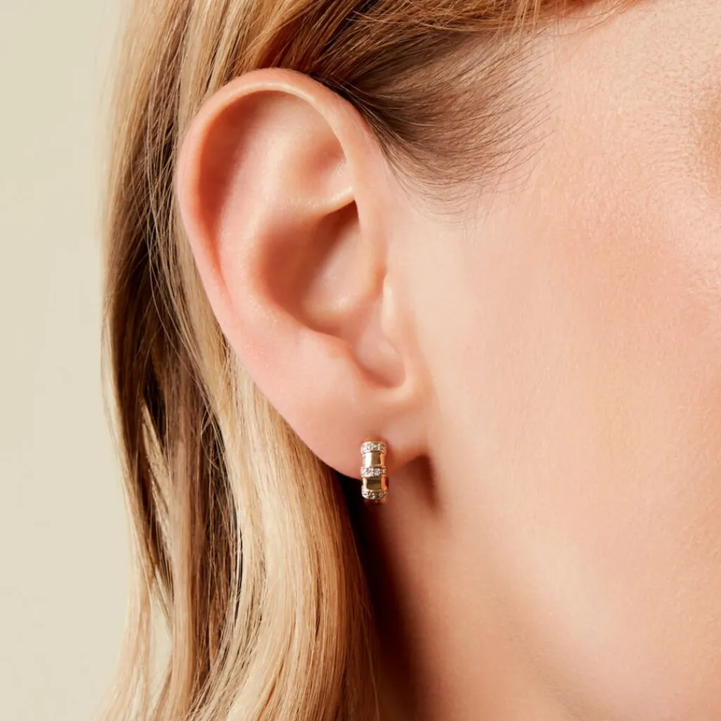 Creoles Or Jaune 375/1000 Demi Jonc Barettes Pavage Diamant Diametre 8,5Mm