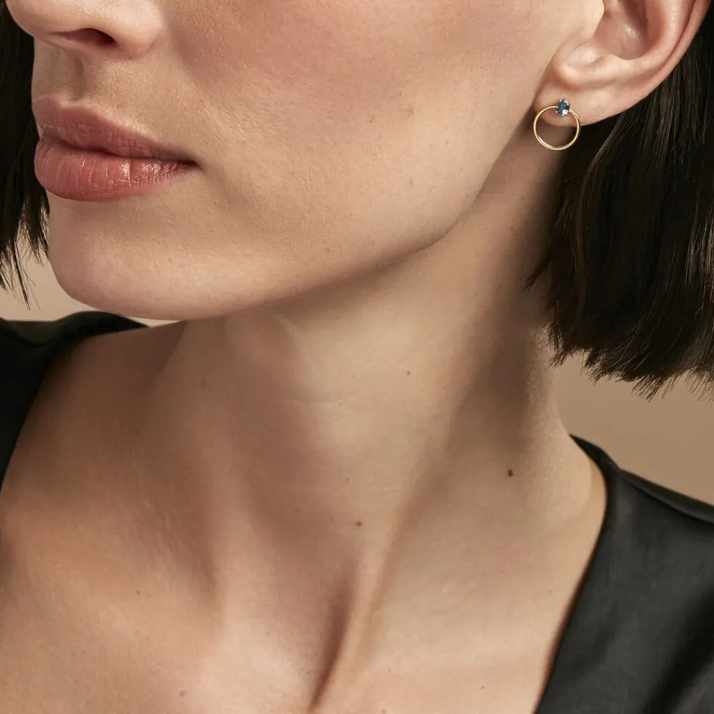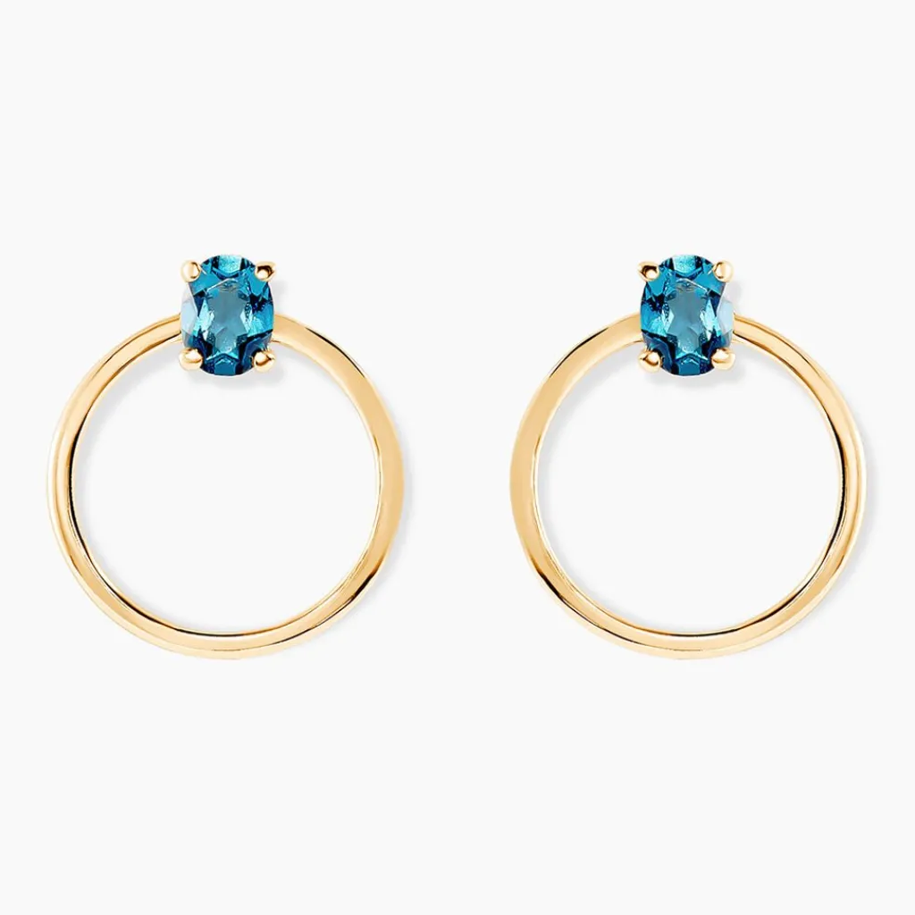 Créoles Or Jaune 375/1000 Ovale Topaze London Blue Serti Griffes