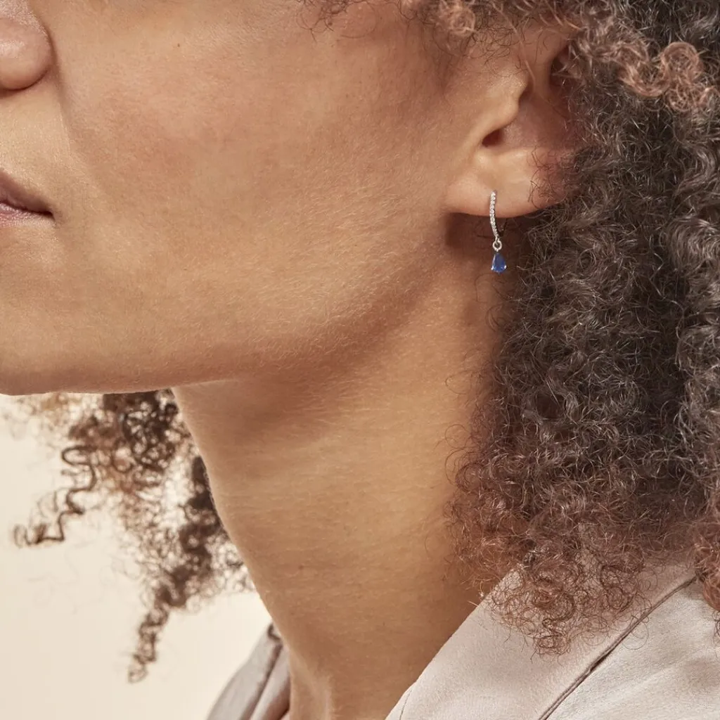 Créoles Or Blanc 375/1000 Saphir Bleu Forme Poire Serti Griffes Pavage Diamants 10mm