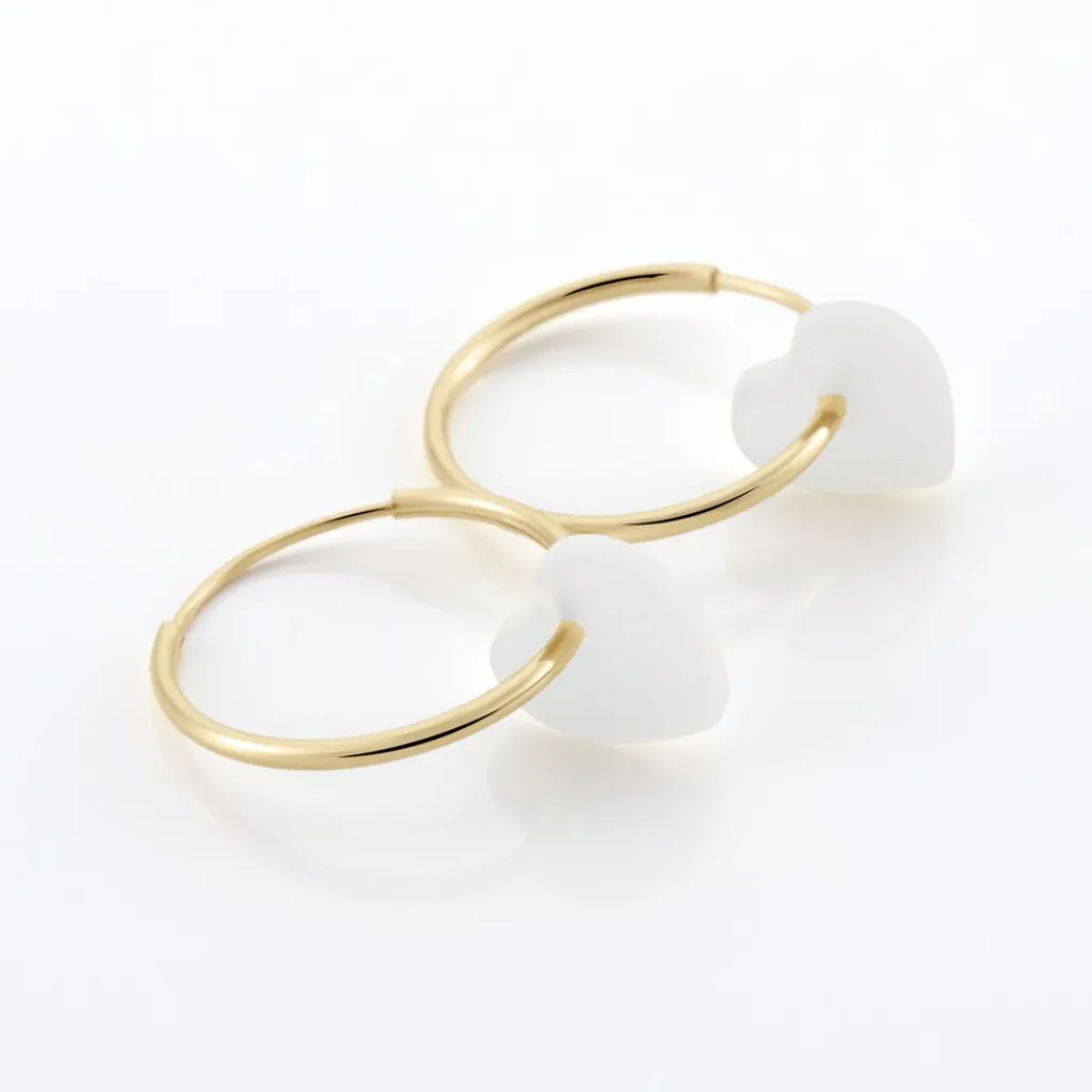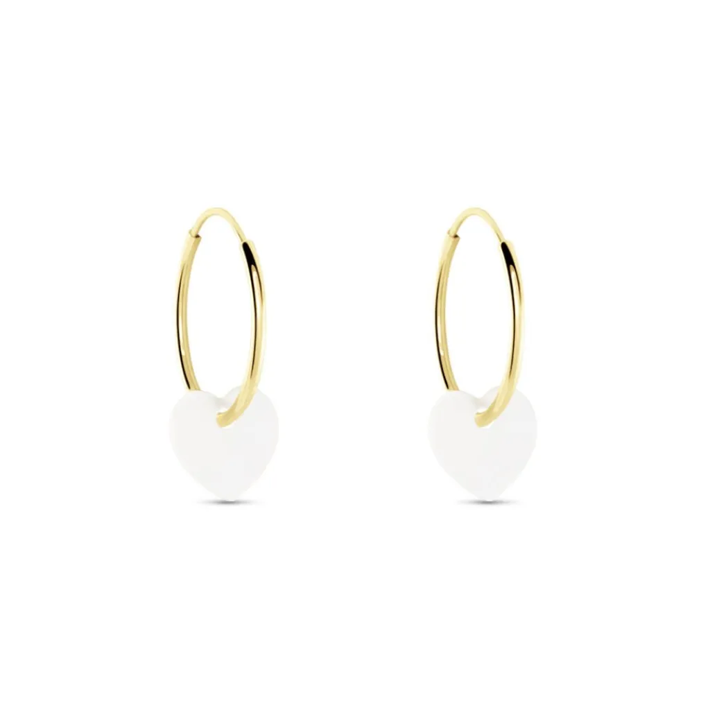 Creoles Or Jaune 375/1000 Pampilles Coeurs Nacre Blanche Largeur 0.8mm Diametre 11mm