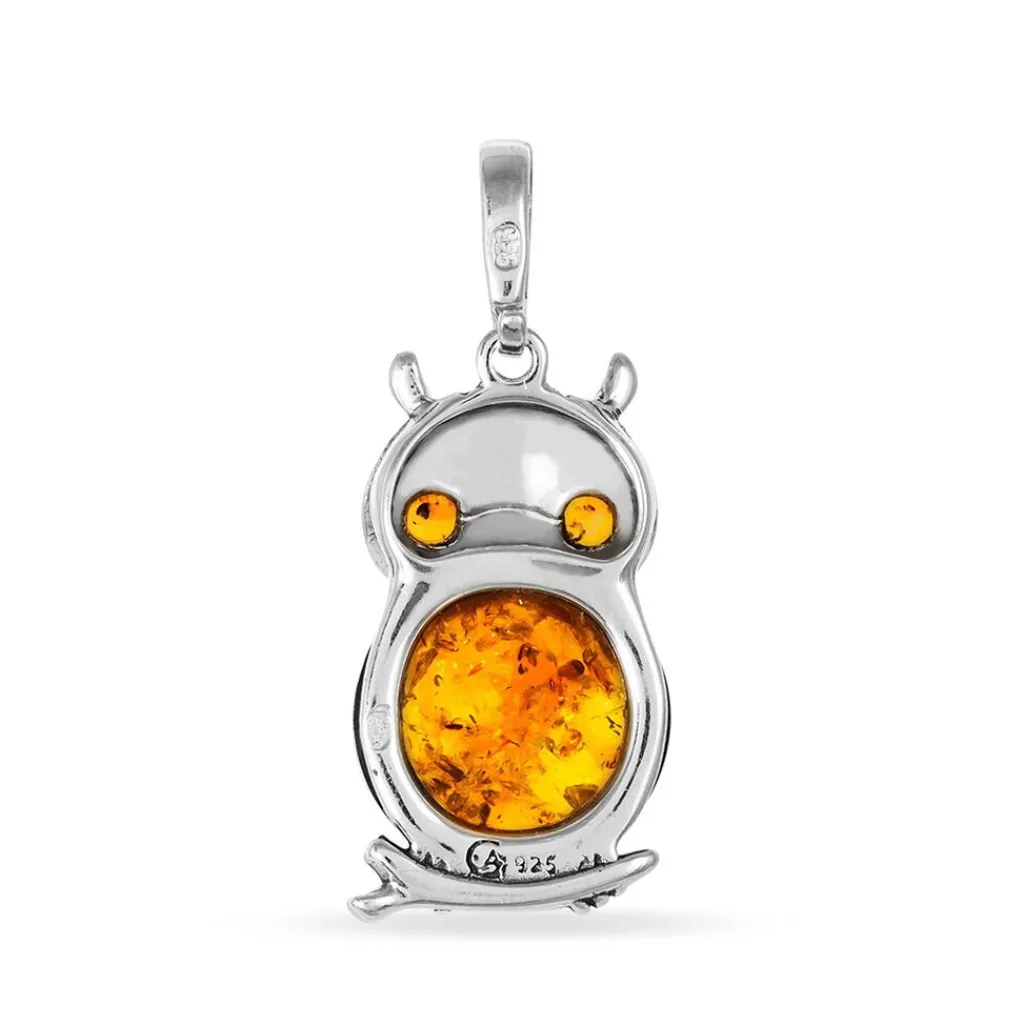 Pendentif Argent Blanc 925/1000 Ambre Forme Hibou